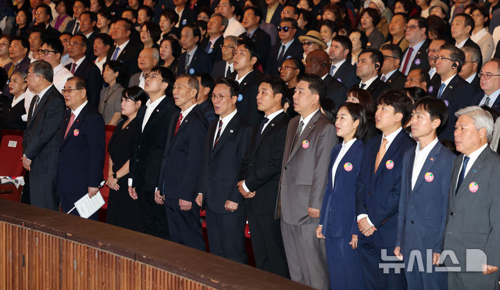[서울=뉴시스]박주성 홍효식 기자 = 3일 오전 서울 종로구 세종문화회관에서 김민석 국무총리를 비롯한 국가 주요 인사, 각계 대표, 시민 등 1200여명이 참석하는 가운데 ‘제4357주년 개천절 경축식’을 개최했다.