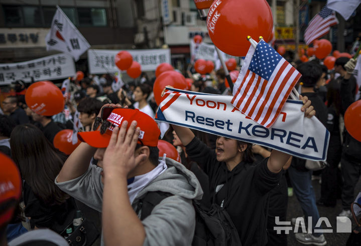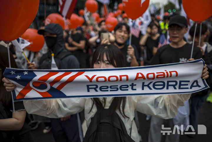 이들은 대형 태극기와 성조기를 흔들며 “이재명 구속” “윤석열 대통령” 구호를 외쳤다.