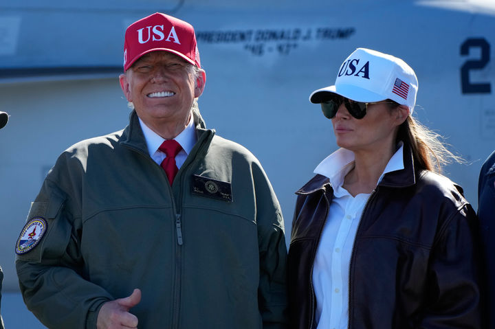 올해 55세인 멜라니아는 이날 행사에서 갈색 가죽 재킷에 하얀 셔츠, 진한 색감의 데님 진을 매치해 캐주얼하면서도 시크한 스타일을 선보였다. 여기에 비행사 스타일 선글라스, 전면에 “USA”가 자수로 새겨진 흰색 야구 모자를 착용해 전형적인 비행사 룩을 완성했다.
