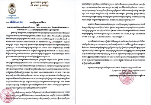 캄보디아 깜폿지방검찰청 대변인 명의 발표문[AKP 통신 홈페이지 캡처. 재판매 및 DB 금지][AKP 통신 홈페이지 캡처. 재판매 및 DB 금지]지난 8월 한국인 대학생이 캄보디아에서 고문당한 뒤 숨진 사건을 수사한 현지 검찰이 중국인 3명을 살인 혐의로 재판에 넘겼습니다.
