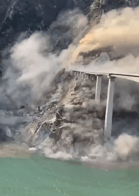 쓰촨성 아바주 솽장커우 수력발전소 인근 훙치대교가 어제(11일) 오후 5시쯤 산사태로 일부 붕괴돼 국도 317호선이 전면 통제됐습니다.