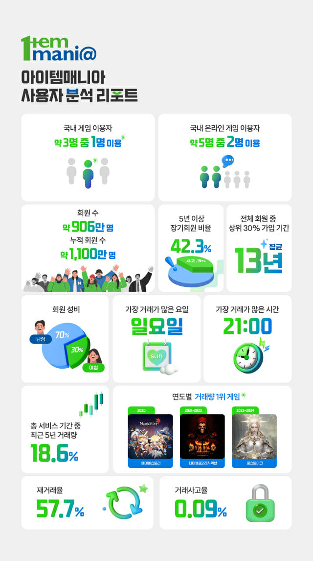 아이엠아이는 국내 최대 게임 아이템 및 계정 거래 플랫폼 아이템매니아의 데이터를 분석한 결과, 이용자 약 3명 중 1명이 이용하고 있다고 2일 밝혔다.