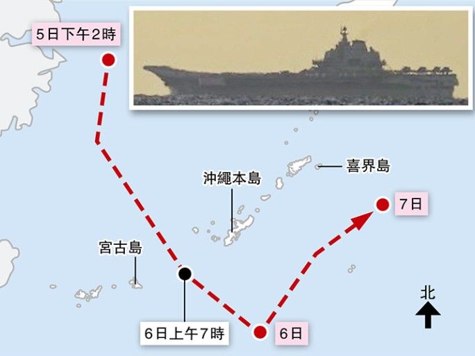 일본 방위성의 관측에 따르면 랴오닝함 전단은 7일 류큐 열도 동쪽 약 600km 지점을 향해 북상해 규슈 남쪽 해역 가고시마현 관할 기카이섬 동쪽 약 190km 지점에 도달했다.
