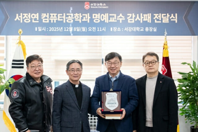 서강대학교(총장 심종혁)는 8일 오전 본관 2층 총장실에서 서정연 서강대학교 컴퓨터공학과 명예교수에게 감사패를 수여했다. 이날 행사에는 서정연 교수와 심종혁 총장, 송태경 대외부총장, 이상근 대외교류처장이 참석했다.