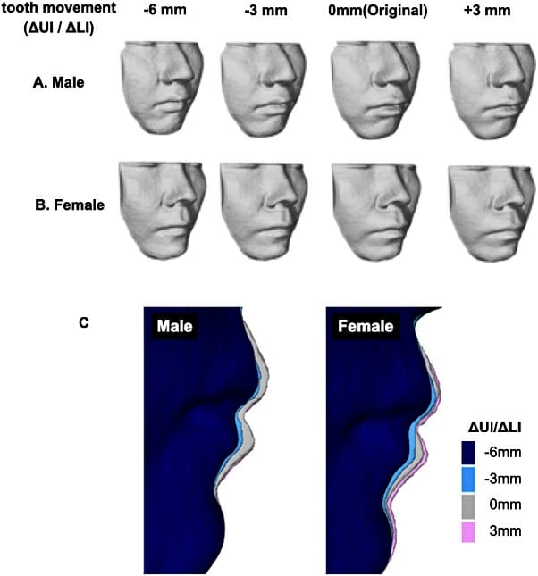 AI 기반 3D 얼굴 시뮬레이션을 활용해 치아 이동량(±3~6mm)에 따른 연조직 변화를 예측한 결과에서는 여성은 남성보다 치아 이동량에 비례해 더 광범위하고 뚜렷한 연조직 변화를 보였다. 특히 입술 및 뺨 부위의 후방 이동 및 볼륨 감소가 여성에게서 두드러지게 나타났는데, 이는 여성의 연조직이 교정 치료에 더 반응성이 높음을 시사한다.