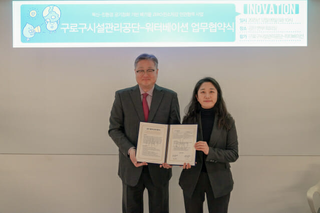 워터베이션은 구로시설관리공단과 역내 공공시설 실내 공기질 개선과 환경폐기물 저감, 공기취약계층 보호를 위한 공기세척장치 현장 실증을 위한 업무협약(MOU)을 체결했다고 9일 밝혔다.