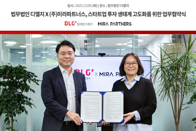 법무법인 디엘지(DLG Law Corporation, 대표변호사 조원희·안희철)는 9일 서울 서초구에 위치한 법무법인 디엘지 본사에서 스타트업과 벤처투자사를 위한 펀드 운영 및 기업 내부 관리 전문기업 미라파트너스(대표 박미라)와 스타트업 투자 생태계의 운영 효율성과 법률 지원 체계 강화를 위한 협약을 맺었다.