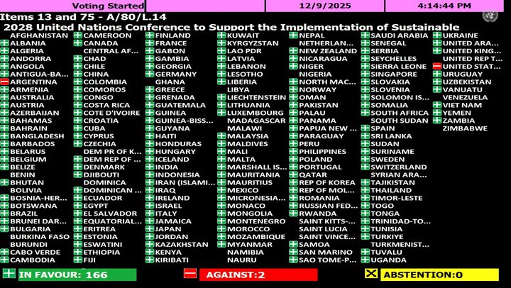 결의안은 찬성 169표, 반대 2표로 통과됐다. 미국과 아르헨티나가 반대했다.