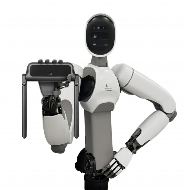 보행보조 웨어러블 로봇 '윔 S'를 들고 있는 휴머노이드 '알렉스' (사진=위로보틱스)
