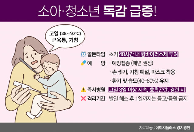 독감은 인플루엔자 A·B형 바이러스에 의해 발생하는 급성 호흡기 감염병이다. 고열과 오한, 근육통, 두통 등 전신 증상이 나타나는 것이 특징이다. 영유아는 탈수, 구토, 식욕저하, 보채기가 동반될 수 있으며 고열이 3일 이상 지속되거나 호흡곤란, 청색증, 경련이 나타나면 즉시 진료가 필요하다.