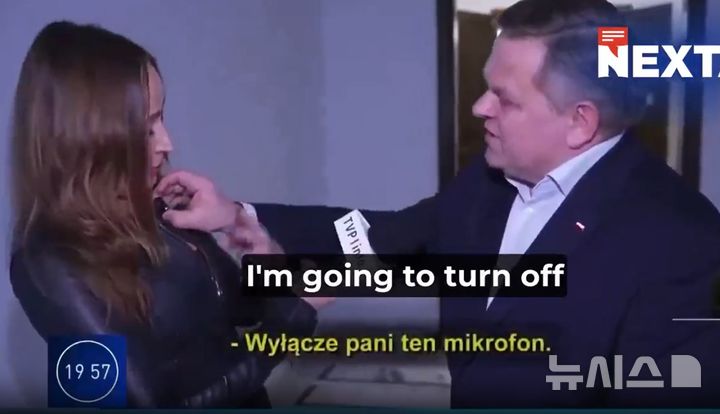 [서울=뉴시스]박지혁 기자, 유지학 인턴기자 = 폴란드의 한 상원의원이 인터뷰 도중 여성 기자의 옷깃에 달린 마이크를 강제로 떼려고 한 시도한 영상이 공개되며 논란이 일고 있다.