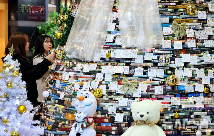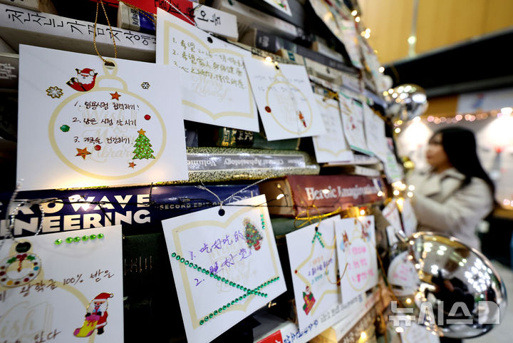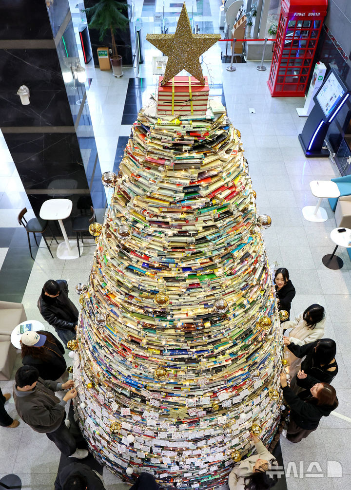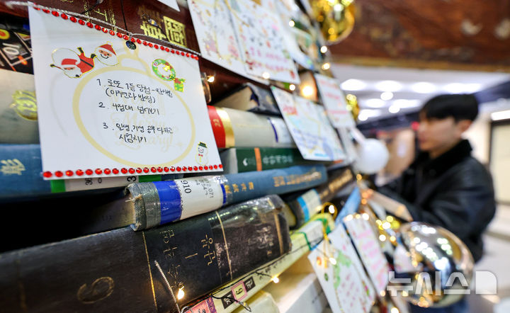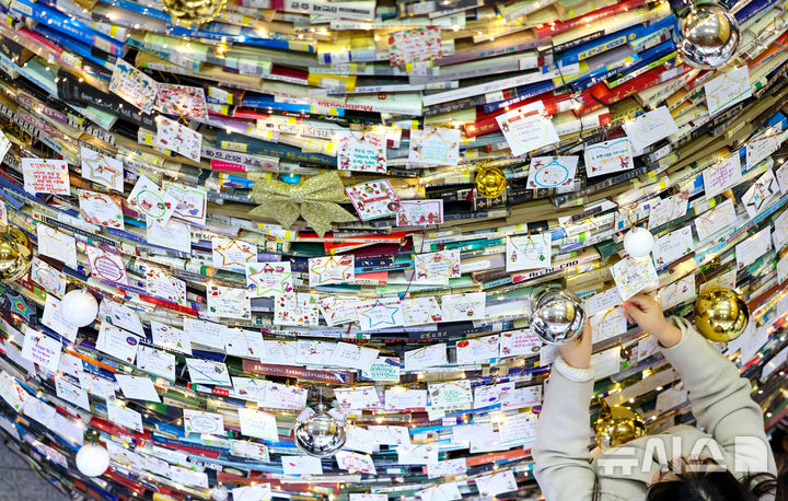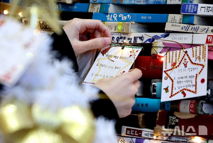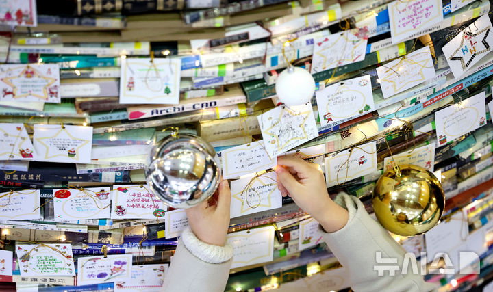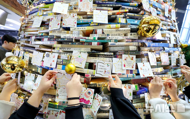 [서울·경산=뉴시스] 류현주 이무열 기자 = 16일 경북 경산시 대구대학교 경산캠퍼스 창파도서관에서 학생들이 북(Book) 트리에 새해 소원을 담은 소원지를 매달고 있다.