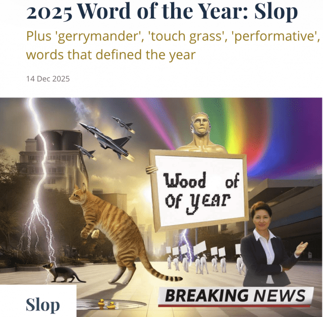 웹스터 사전은 슬롭을 “저품질의 디지털 콘텐츠로 주로 AI 기술을 활용해 대량 생산한 것”이라고 규정하고 있다.