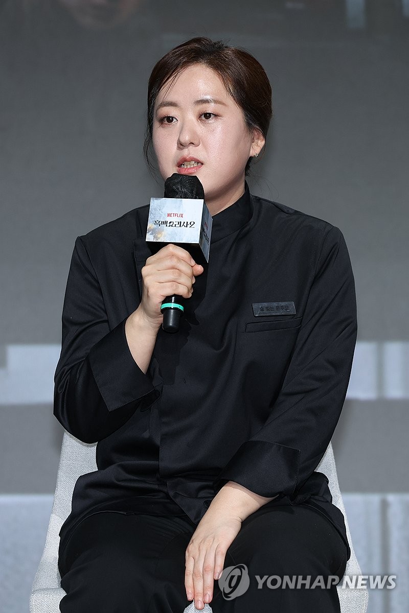 (서울=연합뉴스) 류효림 기자 = 흑백요리사2에 출연한 ‘술빚는 윤주모’가 17일 서울 종로구 JW메리어트동대문스퀘어에서 열린 넷플릭스 예능 ‘흑백요리사: 요리 계급 전쟁2’ 기자간담회에서 인사말을 하고 있다. 2025.12.17