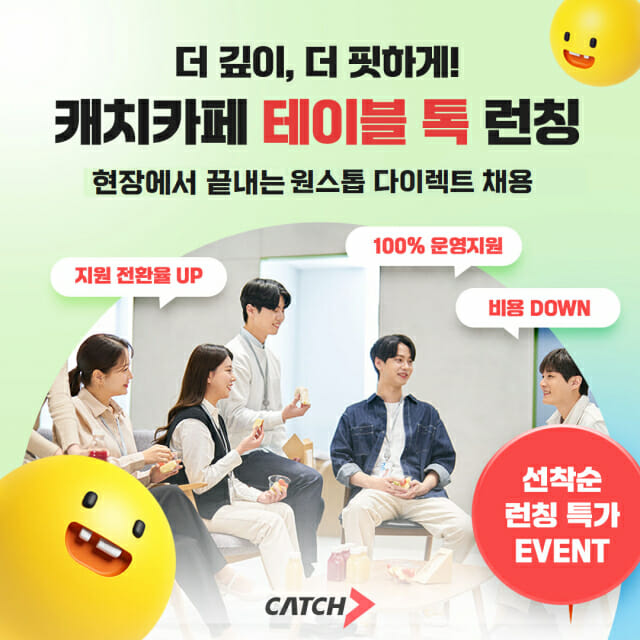 테이블 톡은 기업 인사담당자가 사전 선발된 5~7명의 핵심 인재와 캐치카페에서 직접 만나 직무 상담부터 면접까지 원스톱으로 진행하는 ‘다이렉트 채용’ 프로그램이다. 온라인 공고 중심의 기존 채용 방식에서 벗어나, 현장에서 인재를 만나 채용 여부를 판단할 수 있도록 설계된 것이 특징이다.