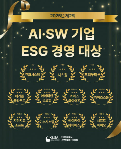 한국인공지능·소프트웨어산업협회(KOSA)는 AI·SW 산업 분야의 ESG 경영 우수사례를 발굴·확산하기 위한 ‘제2회 AI·SW기업 ESG 경영대상’ 수상 기업을 선정했다고 17일 밝혔다.