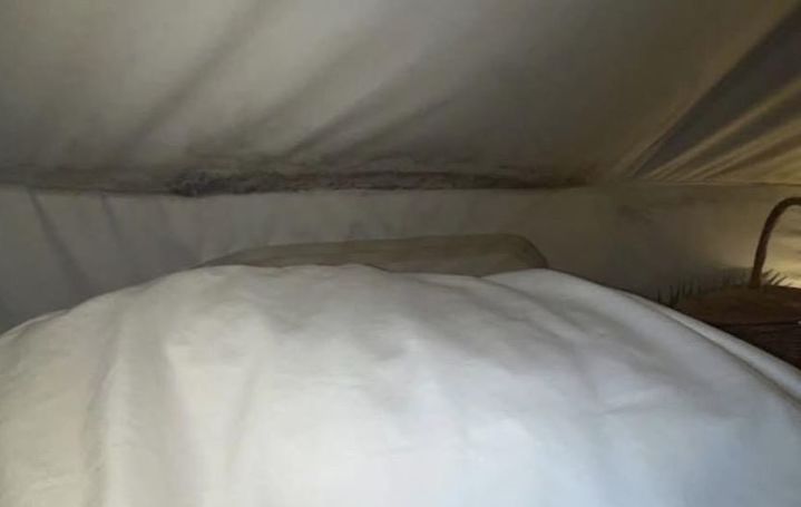 사진 속 침대 머리맡 벽면에는 곰팡이가 득실거렸다. A씨는 침대와 텐트 벽이 맞닿아 있어 호흡 과정에서 곰팡이를 흡입할 가능성이 있다고 설명했다.