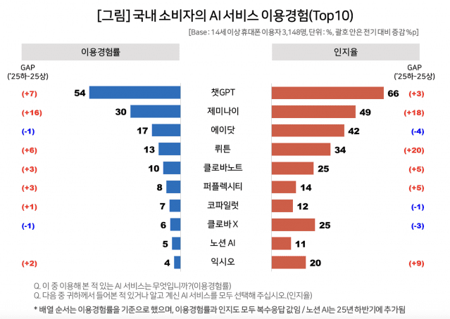 컨슈머인사이트 관계자는 “챗GPT 강세가 여전하지만 제미나이와 토종 서비스 뤼튼의 약진으로 경쟁 구도에 변화 가능성이 보인다”며 “다수 소비자가 호기심 단계를 벗어나 AI를 생활·업무에 활용하는 보편 서비스로 인식하고 있다”고 밝혔다.