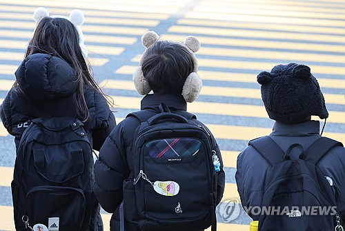 (수원=연합뉴스) 홍기원 기자 = 북쪽에서 찬 공기가 유입되며 전국 대부분 지역의 아침 기온이 영하로 내려간 18일 경기도 수원시 한 초등학교 앞에서 방한 귀마개를 한 어린이들이 등교하고 있다. 2025.11.18