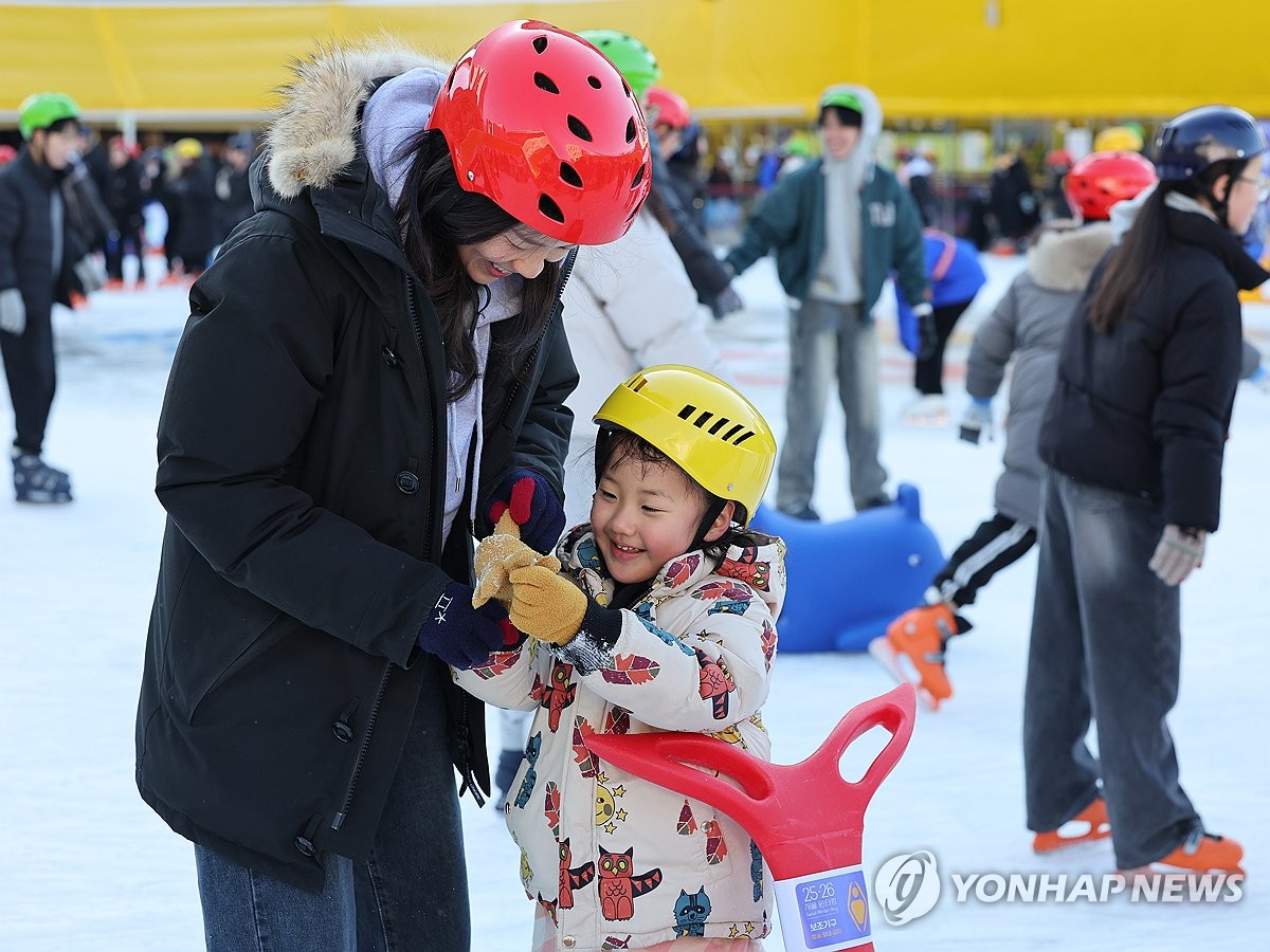 (서울=연합뉴스) 서명곤 기자 = 21일 서울광장 스케이트장에서 시민들이 활짝 웃고 있다.