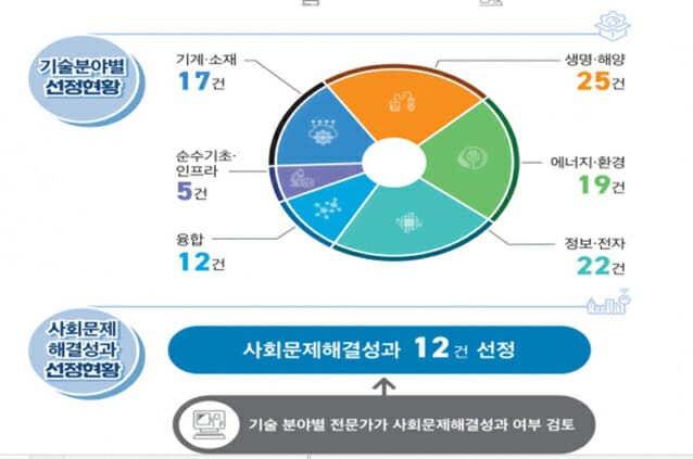 각 부·처·청이 선별, 추천한 총 970건의 후보 성과를 대상으로 연구개발 효과(완성도, 수준 향상, 개발 촉진) 및 경제 사회적 파급 효과 등을 종합 평가한 결과 ▲기계·소재 17건 ▲생명·해양 25건 ▲에너지·환경 19건 ▲정보·전자 22건 ▲순수기초·인프라 5건 ▲융합 12건 등이 최종 100선으로 선정됐다.