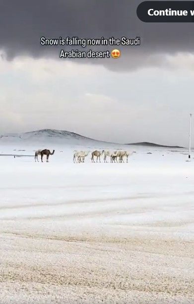 또 다른 영상에서는 눈 덮인 사막 한가운데 낙타가 서 있는 이색적인 풍경이 연출됐다.