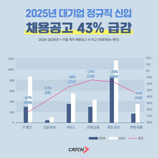 상위권 채용 플랫폼 캐치가 2024년과 2025년(각 1~11월 기준) 자사 사이트에 게재된 대기업 정규직 신입 채용 공고를 분석한 결과, 2025년 공고 수는 2천145건으로 전년(3천741건) 대비 43% 줄어든 것으로 나타났다.