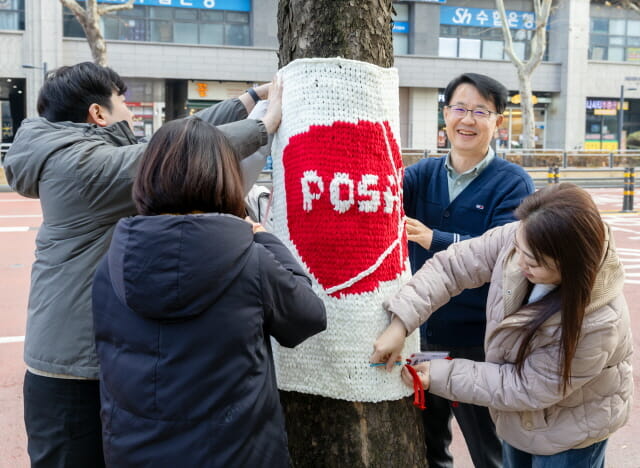 한국우편사업진흥원 뜨개동호회 ‘뜨기&뜨다’는 24일 손으로 직접 뜬 니트 작품으로 나무를 감싸는 ‘니팅트리(나무 옷 입히기)’를 통한 사회공헌을 진행했다.