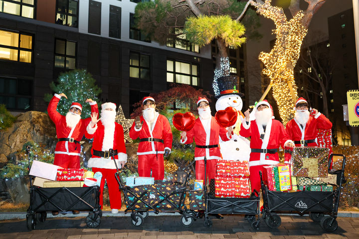 산타들은 아이들의 이름을 다정하게 부르며 덕담과 함께 선물을 건넸다. 이를 지켜보는 부모들의 얼굴에는 웃음꽃이 피었다.