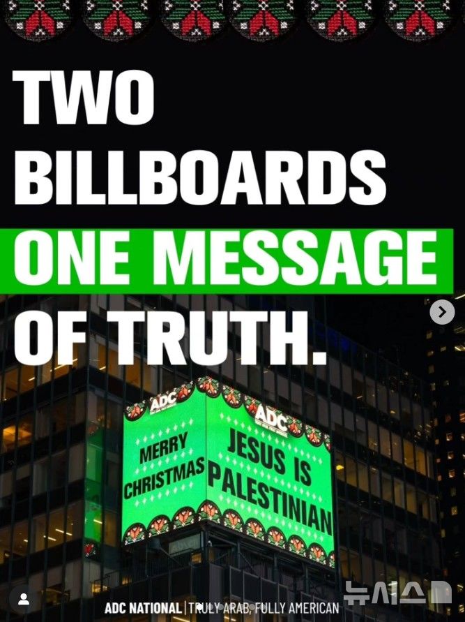 [서울=뉴시스]박지혁 기자, 김다빈 인턴기자 = 미국 뉴욕의 타임스퀘어 전광판에 “예수는 팔레스타인인(Jesus is Palestinian)입니다”라는 문구가 담긴 대형 광고가 등장해 논란이 일고 있다.
