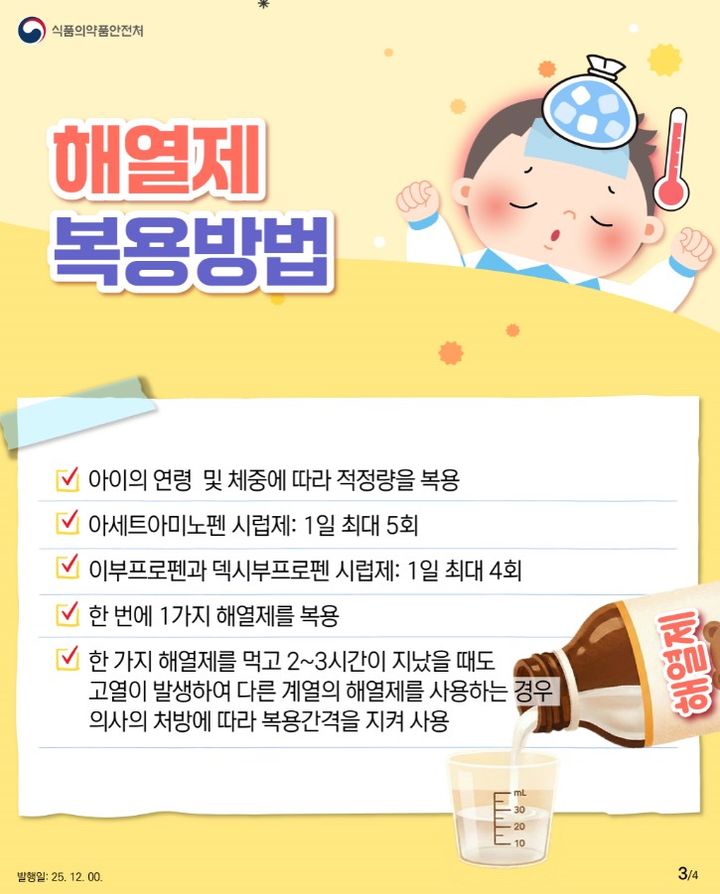 구체적으로 ▲해열제는 열이 어느 정도 올랐을 때 먹이면 되는지 ▲해열제 복용 후에도 열이 떨어지지 않으면 언제 다시 먹여야 하는지 ▲해열제 복용 시 주의해야 할 사항이 있는지 등을 알아두는 것이 좋다.