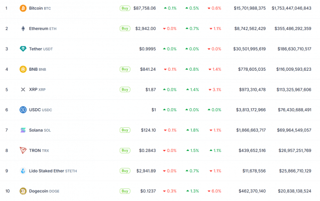 반면 대부분 주요 디지털자산은 하락세를 보였다. 비트코인은 주간 기준 약 0.6% 하락하며 8만7천 달러대에서 소폭 조정을 받았다.