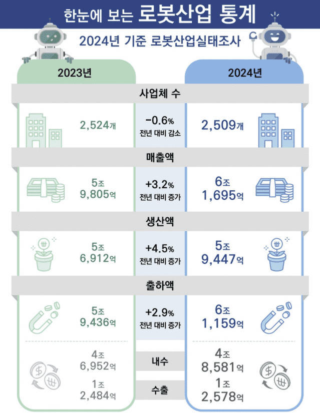 산업통상부가 한국로봇산업진흥원, 한국AI로봇산업협회와 함께 공동으로 조사한 ‘2024년 로봇산업 실태조사’에 따르면, 지난해 국내 로봇산업 매출은 6조1천695억원을 기록했다. 생산 규모는 전년 대비 4.5% 증가한 5조9천447억원으로 집계됐다.