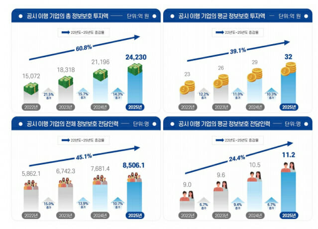 보고서에 따르면, 올해 정보보호 투자액(2조 4230억원)은 전년(2조 1196억원)보다 14.3% 증가했고, 정보보호 전담인력(8506.1명)도 전년(7681.4명)보다 10.7% 늘었다.