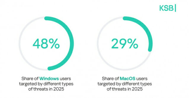 ▲윈도우는 여전히 가장 큰 공격 표적: 윈도우(Windows) 환경은 사이버 공격의 주요 대상이 되고 있다. 2025년 한 해 동안 윈도우 사용자 48%가 다양한 유형의 위협에 노출됐고, 맥(Mac) 사용자는 29%가 공격을 경험한 것으로 나타났다.