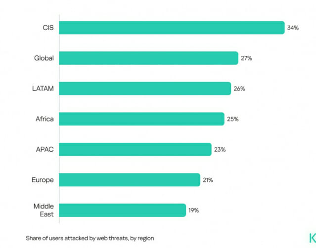 ▲27%가 웹 기반 위협: 세계적으로 27%의 사용자가 웹 기반 위협의 공격을 받았다. 웹 기반 위협은 사용자가 인터넷에 접속했을 때 감염을 유발하는 악성코드를 의미하며, 반드시 온라인 활동 중에만 국한되지는 않지만, 공격 단계 중 일부는 반드시 인터넷 연결을 필요로 한다는 점이 특징이다.