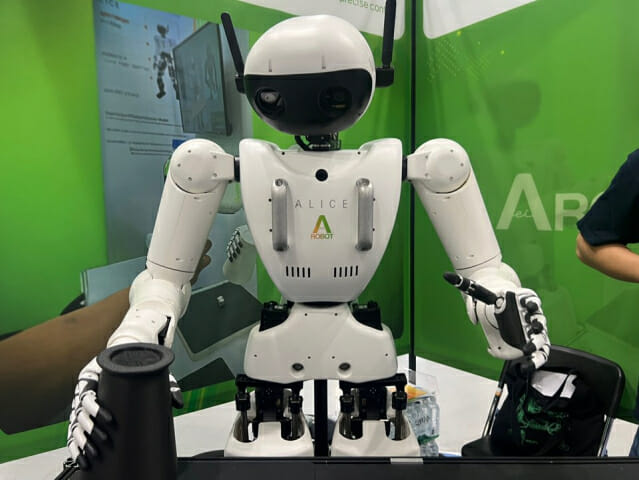 에이로봇은 휴머노이드 ‘앨리스’ 시리즈를 활용해 두 대의 로봇이 역할을 나눠 공정을 이어가는 시나리오를 선보인다. 컨베이어에서 물체를 집어 옮기고, 다시 다른 위치로 이송하는 작업을 끊임없이 반복하며 실제 공장 환경과 유사한 흐름을 구현한다.