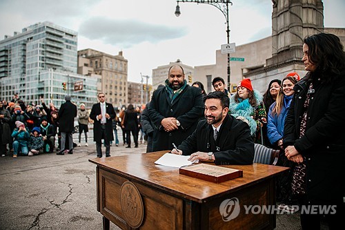 행정명령에 서명하는 조란 맘다니 뉴욕시장[뉴욕 AP=연합뉴스 자료사진 제공][뉴욕 AP=연합뉴스 자료사진 제공]성경 대신 쿠란에 손을 얹고 취임 선서를 한 조란 맘다니 뉴욕 시장이 업무 시작과 동시에 이스라엘과 갈등을 빚었습니다.