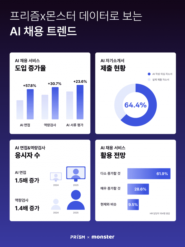 AI 서류 분석 서비스 프리즘도 도입 고객이 2024년 대비 23.6% 증가했다. 프리즘은 AI 작성 여부 검사, 자소서 내용 평가, 경험 기반 맞춤 면접 질문 가이드 제공 등의 기능을 제공한다.