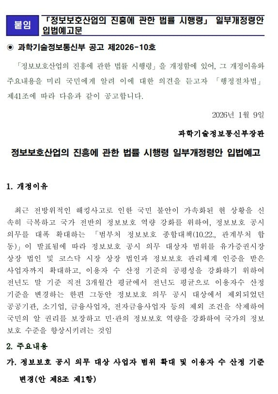 과기정통부가 ‘정보보호산업의 진흥에 관한 법률(이하 정보보호산업법) 시행령’ 개정안을 이번달 9일부터 다음달 19일까지 40일간 입법예고한다.