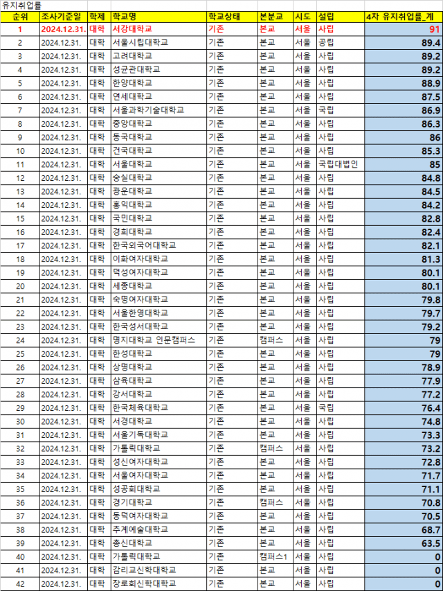 또 대학 졸업자가 취업 후 일정 기간이 지난 후에도 취업상태인지를 보여주는 ‘유지취업률’은 취업의 질적인 면을 보여주는 척도인데, 서강대학교는 4차 유지취업률 역시 서울 소재 대학 중 3년 연속 1위를 차지했다.
