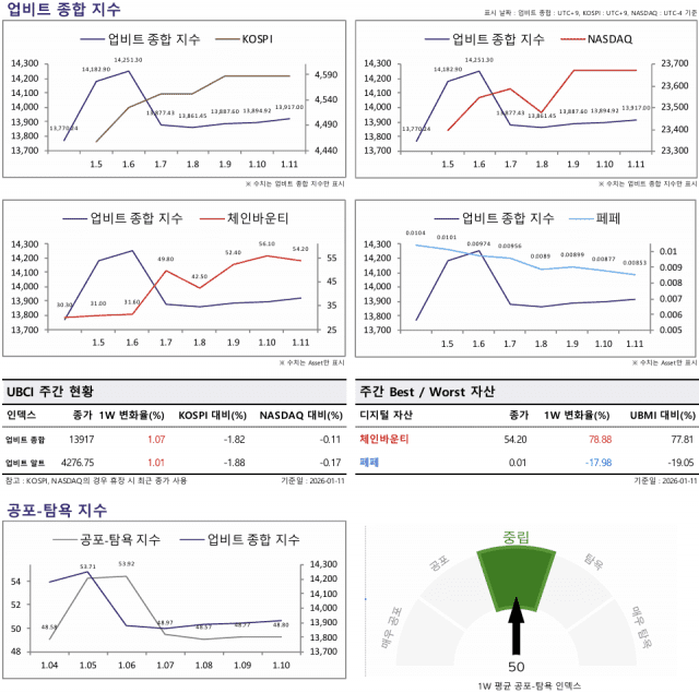 주간 공포·탐욕 지수 평균은 50.25로 중립 단계에 머물렀으며, 지수 범위는 48.57에서 53.92 사이로 집계됐다.