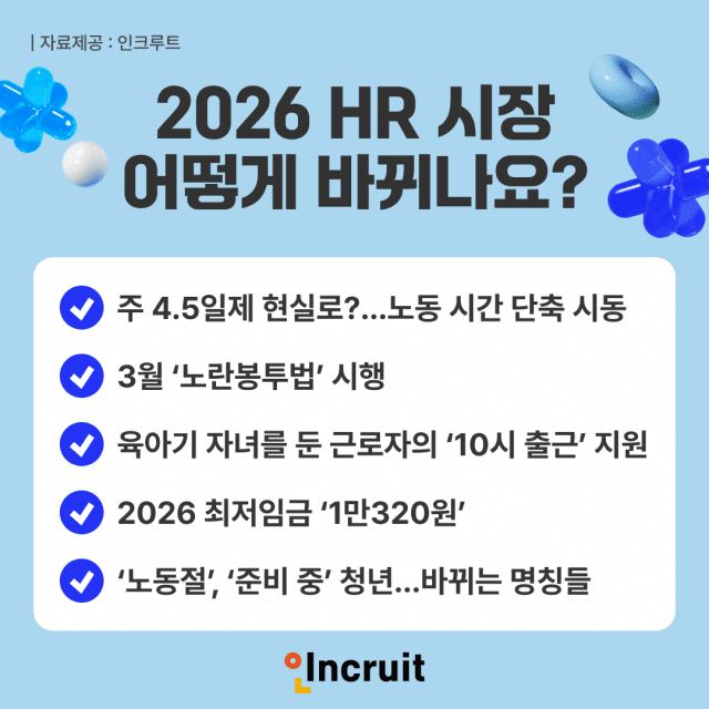인크루트(대표 서미영)가 분석한 ‘2026년 달라지는 HR 제도’에 따르면, 올해 인사관리의 핵심 키워드는 실질 노동시간의 단축과 유연한 근무 환경 조성으로 요약된다.