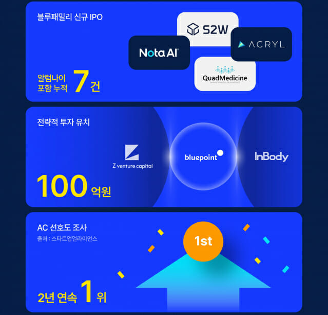 지난해 S2W, 노타 AI, 아크릴, 쿼드메디슨 등 블루포인트로부터 투자 유치 이력이 있는 4개 기업이 기업공개(IPO)에 성공했다. 알럼나이 포함 투자 기업의 IPO는 누적 7건으로 늘었다.