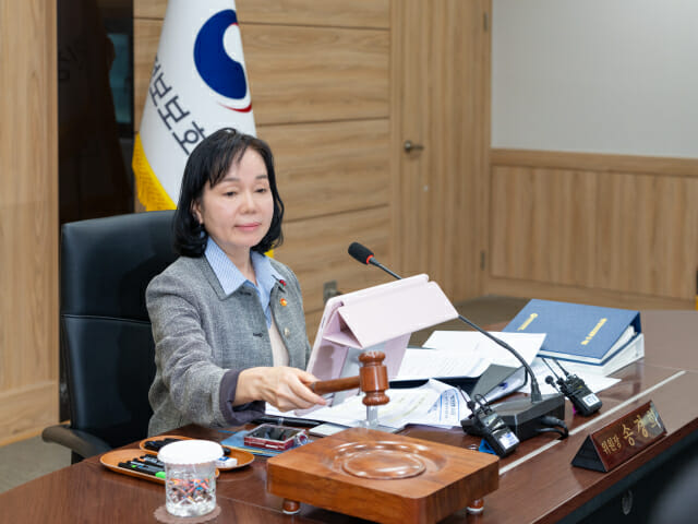 송경희 개인정보보호위원회 위원장이 1월 14일 오후 서울 종로구 정부서울청사에서 개최된 2026년 제1회 개인정보보호위원회 전체회의에서 의사봉을 두드리고 있다.