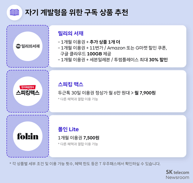 스피킹맥스는 AI 원어민에게 배우는 영어 회화 앱이다. T우주에선 두근톡 30일 이용권을 월 7천900원에 제공한다. 폴인라이트는 비즈니스 트렌드와 인사이트를 함께 확인할 수 있는 플랫폼이다. 1개월 이용권은 7천500원이다.