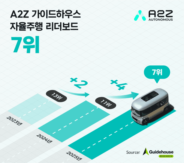 자율주행 스타트업 오토노머스에이투지(에이투지)는 글로벌 컨설팅사 가이드하우스가 발표한 2025년 자율주행 리더보드에서 세계 7위에 오르며 역대 최고 성과를 달성했다고 18일 밝혔다.