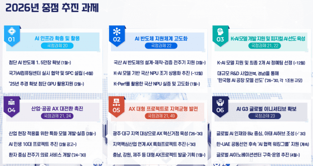공공 AX 프로젝트 사업은 예산과 과제를 대폭 확대했다. 민생 10대 프로젝트 등 소비·생활, 사회 안전 관련 국민 효능감이 높은 분야에서 AI 혁신 서비스를 단기간 내 도입하도록 할 예정이다.
