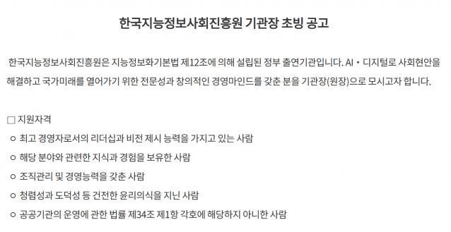 NIA는 공고문을 통해 “인공지능(AI)·디지털로 사회 현안을 해결하고 국가 미래를 열어가기 위한 전문성과 창의적 경영 마인드를 갖춘 인재를 기관장으로 초빙할 것”이라고 밝혔다.