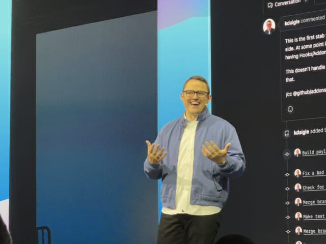 카일 데이글 깃허브 최고운영책임자(COO)가 기조연설을 하고 있다.